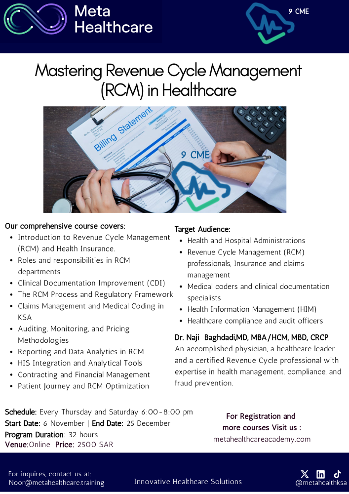 يهدف هذا البرنامج الشامل إلى تزويد المشاركين بالمعرفة والمهارات العملية في مجال إدارة دورة الإيرادات في الرعاية الصحية (RCM)، والتي تمثل أحد أهم العناصر لضمان الاستدامة المالية وجودة الخدمات الصحية. يركّز البرنامج على فهم دورة الإيرادات من التسجيل وحتى تحصيل المطالبات، مع تسليط الضوء على القوانين التنظيمية في المملكة العربية السعودية، وأفضل الممارسات في التوثيق الطبي، وإدارة المطالبات، والتدقيق، والتحليل المالي، إضافة إلى تعزيز تجربة المريض من خلال كفاءة العمليات.